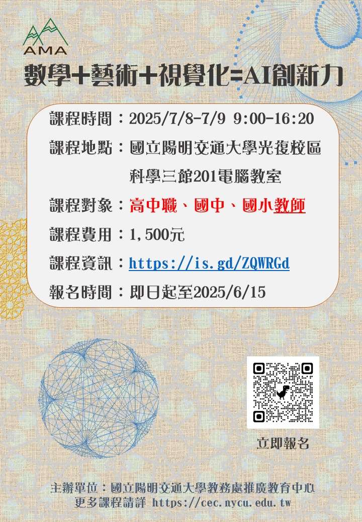 一、旨揭課程融合數學 × 藝術的視覺化創作精神,結合 STEAM 教育理念,透過專為圖形結構與視覺資訊設計而生 的 AMA 平台,帶領學員深入探索幾何變換與集合運算在對 稱、鑲嵌、疊代與規則圖案生成中的應用,並引導將這些 抽象概念轉化為具體的圖像藝術與創意表徵,激發數理思 維與藝術表達的雙重潛能。讓數學成為啟發創造力與洞察 力的橋樑,開啟智慧(Activating Intelligence)的新視 界。