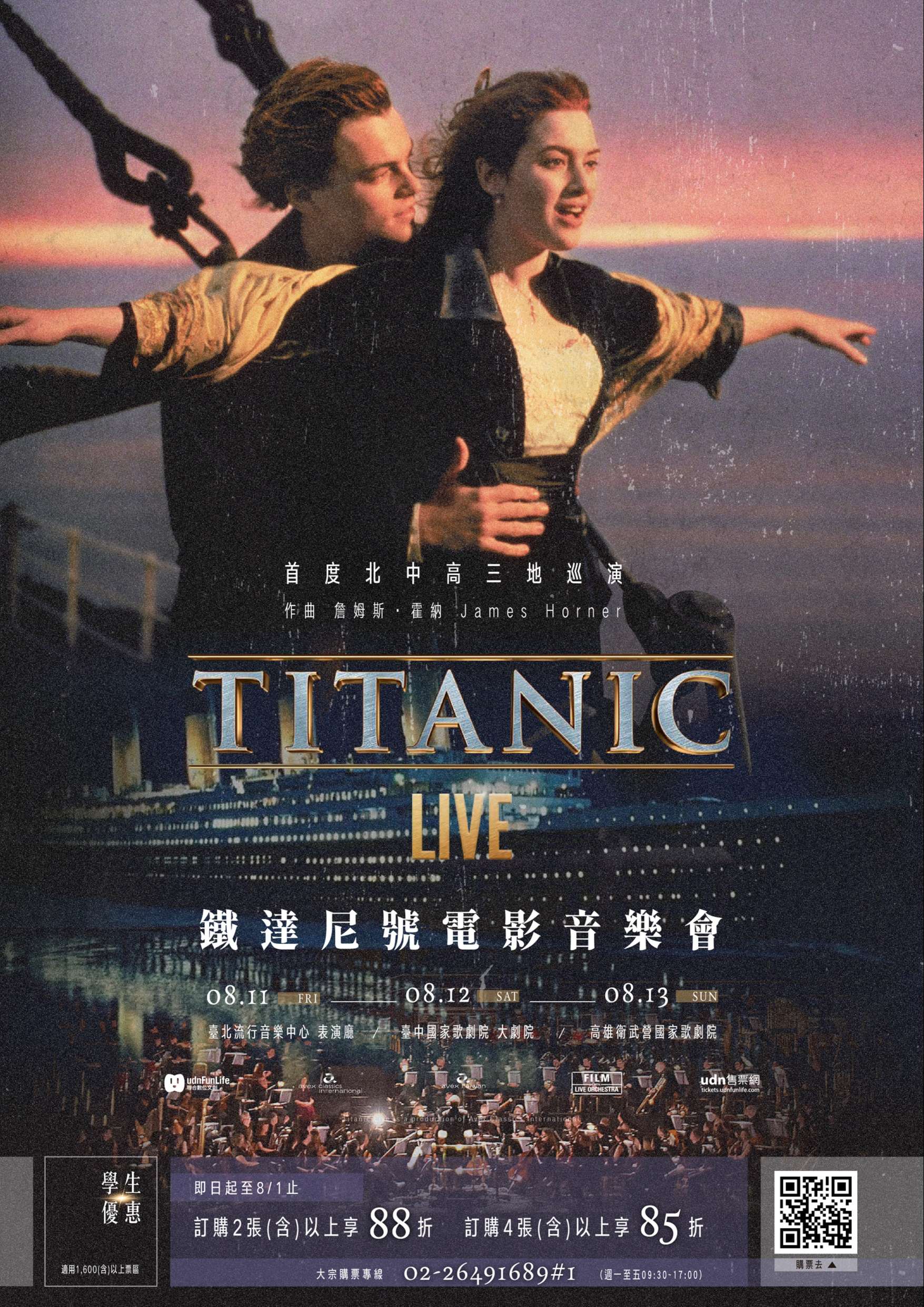 (二)節目介紹:跨越世代的經典電影《鐵達尼號》耗資上億美元,是當時最昂貴的電影,為了真實還原歷史,導演詹姆斯.卡麥隆 (James Cameron) 特地打造了1:1的模 型拍攝,同時採用最先進的電腦動畫技術,讓觀眾身歷其境地參與歷史事件之中。上映總票房就超過18.4億美元,是全世界首部突破10億美元大關的電影,盤據全球影史賣座排行榜冠軍長達12年,目前仍高居第3名。《鐵 達尼號》在該年的奧斯卡獎也大放異彩,共獲得14項提名,最終獲得11座獎項,包括最佳影片、最佳導演、最佳攝影、最佳視覺效果、最佳原創音樂、最佳原創歌曲等,同時還創下10項金氏世界紀錄:成本最高電影、票房最高的劇情片等,在全球影史上的地位難以取代。 《鐵達尼號》配樂由傳奇好萊塢電影作曲家詹姆斯.霍納James Horner一手打造,除獲得奧斯卡肯定外,亦獲得3座葛萊美獎,並被認證為史上最暢銷的電影配樂專輯。由席琳狄翁 (Celine Dion) 演唱的主題曲〈My Heart Will Go On〉更是傳唱大街小巷,是音樂史上最暢銷單曲之一,在全球超過二十國排行榜登上冠軍。今 年8月將以超過百人的管絃樂團及合唱團編制現場演出,讓觀眾有如身歷其境的感受,當樂音響起時,與傑克和蘿絲共同出航,體驗這具有歷史意義以及淒美愛情的航行。演出時間預計215分鐘,含中場休息20分鐘。