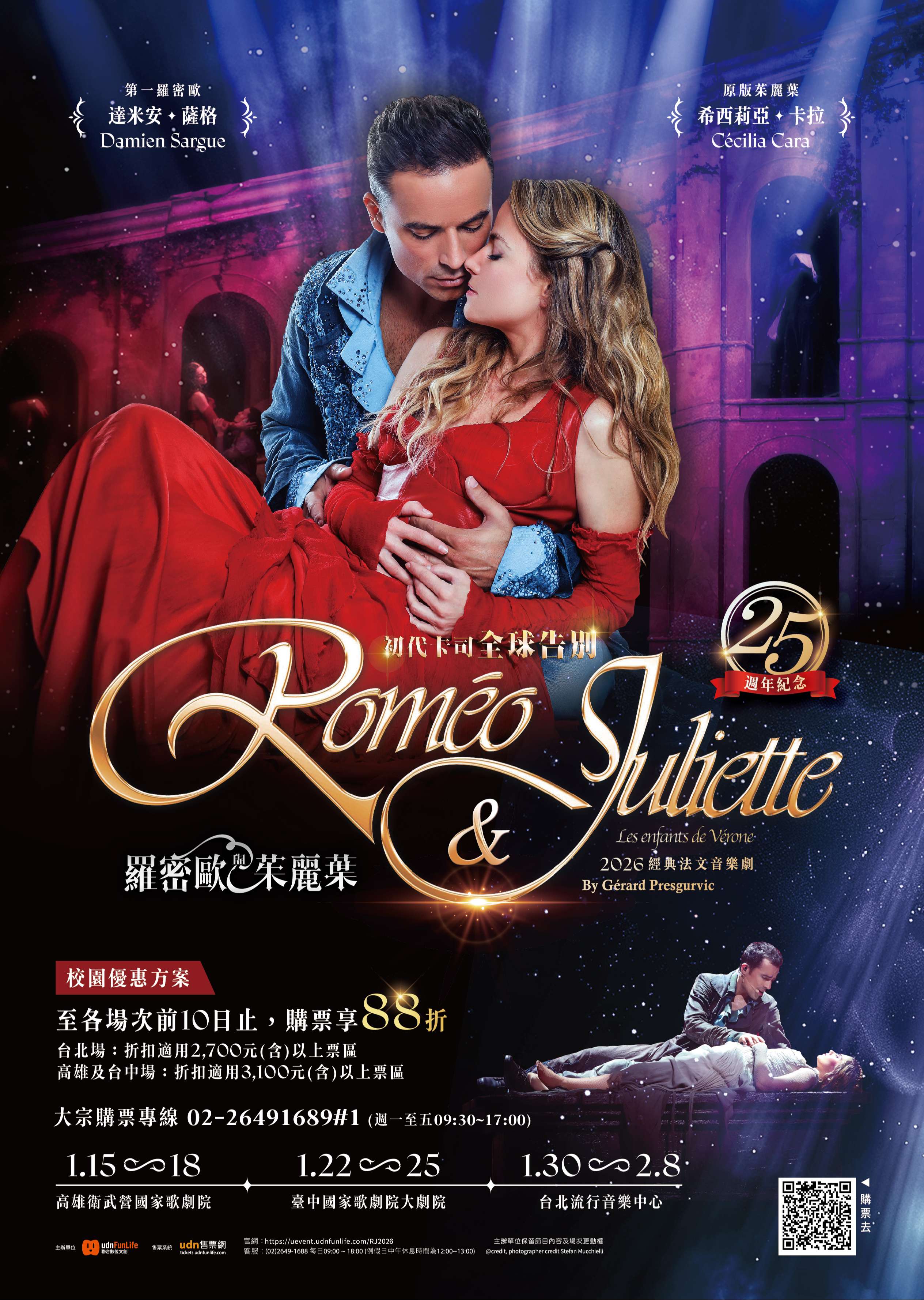一、經典法文音樂劇《羅密歐與茱麗葉》自2001年在巴黎首演 即轟動全球,以磅礴動人的音樂、現代感十足的編舞與都 市巴洛克風格美學,重新詮釋莎士比亞經典悲劇,劇中更以紅與藍兩大色系象徵家族對峙,展現強烈視覺張力;而初代卡司的演出早已成為大眾心中難以取代的記憶,本次適逢音樂劇25周年同時也是初代卡司告別巡演,讓這次在台灣的演出更具紀念性。法文音樂劇以獨樹一格的「演唱 會」形式製作打造,特別強調「音樂」與「演員魅力」, 以「歌」帶「戲」是法式音樂劇製作的順序與模式,藉由歌曲詠唱以及雋永詞彙的表達,再加上多樣化背景音樂襯托,讓演員的情緒起伏及情感傳遞更加深刻。誠摯推薦師生前來觀賞國際級精彩演出,並藉此增進對各類表演類型的了解。
