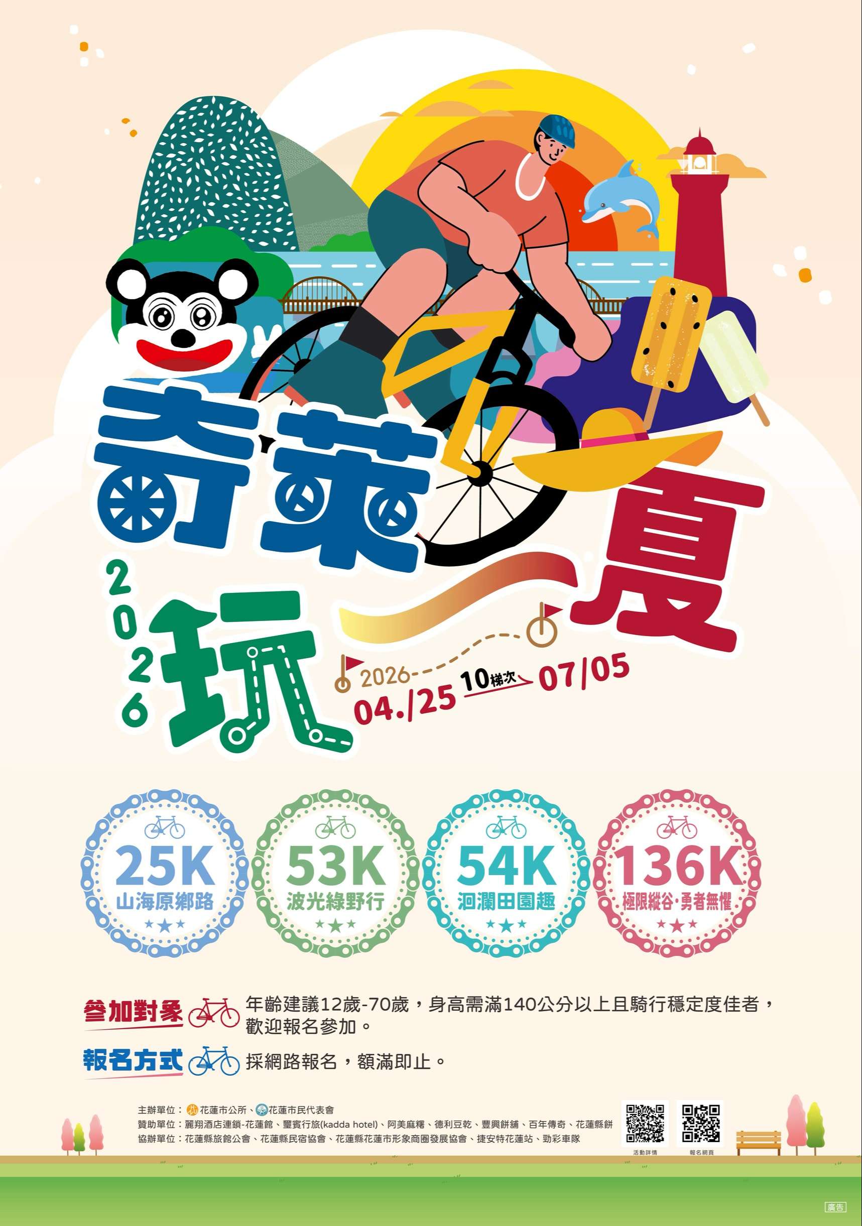 二、為振興花蓮觀光產業,並推廣永續旅遊理念,本年度規劃以自行車為媒介,串聯花蓮在地美景與特色產業。